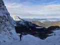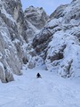 Belopeško jezero v jutranji osmi uri je komajda kaj oblegano. Snega ni veliko, a poteptana cesta, ki vijuga proto koči, je udobna. Le-te se ne pustimo zapeljati do planinske postojanke. Skozi gozd po nadelani sledi jo mahnemo proti cilju. Igra preko vzboklin in drsenja v dolinice nas zabava, vsaj naju z Alenom. Hitra sva. Počakava Nino, Miha in Damjana. Nad nama občudujeva tukaj vedno dih jemajoč pogled na skoraj navpično dvigajočih se sten gora od Ponc do Mangarta. Nadaljujeva le dva: Alen in jaz. Trojica pa se odloči za obisk koče. Udobno speljani utrjeni smučini slediva pod stene. Pomahava vijugajočim in vriskajočim sonarodnjakom, ki privijugajo mimo naju. Po nekaj okljukih sva pod steno. Grapa v desno naju zvabi do prve zožitve.