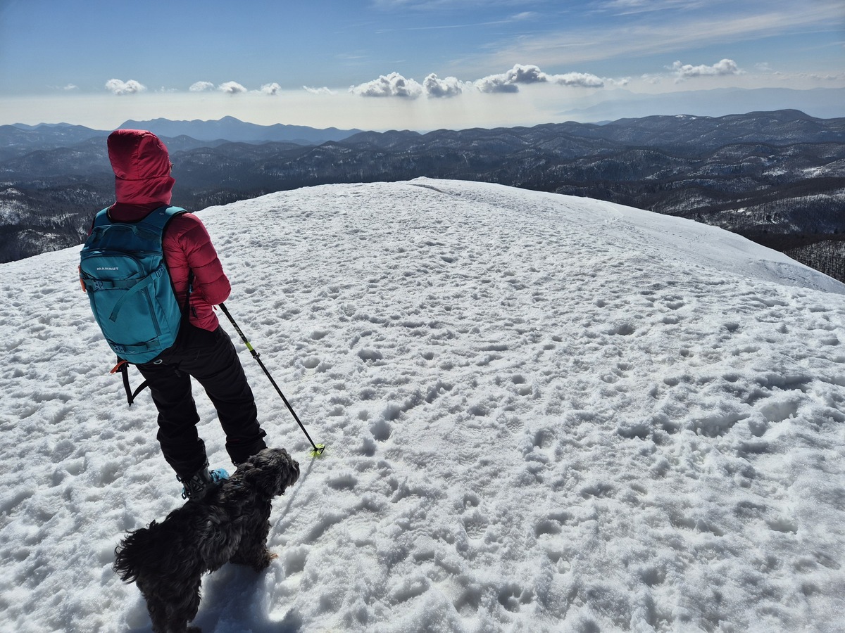 Pogled z vrha proti morju, ki ga prekriva megla.
