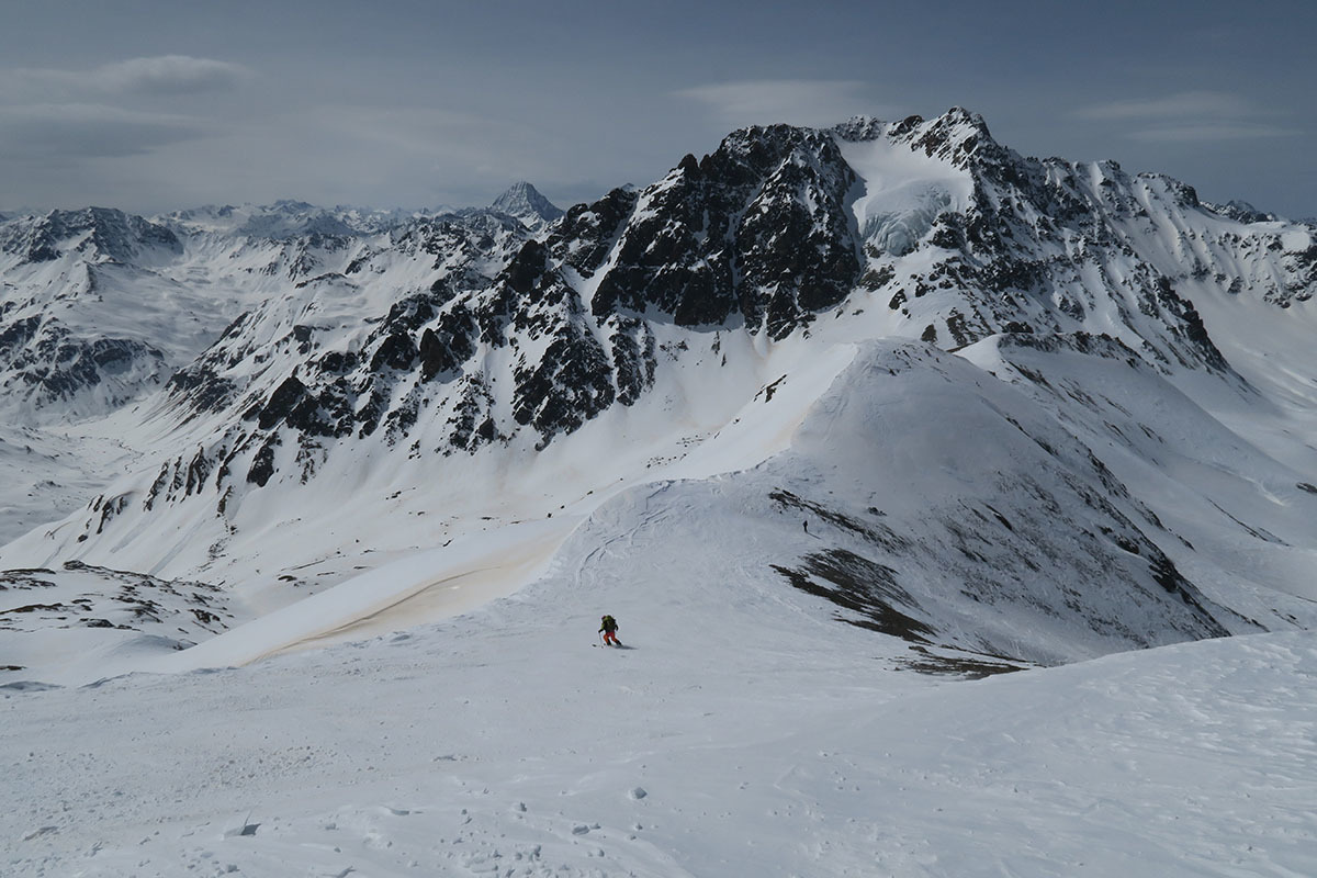 prvi metri pod Grenzeckkopfom, zadaj gleda ven Piz Buin