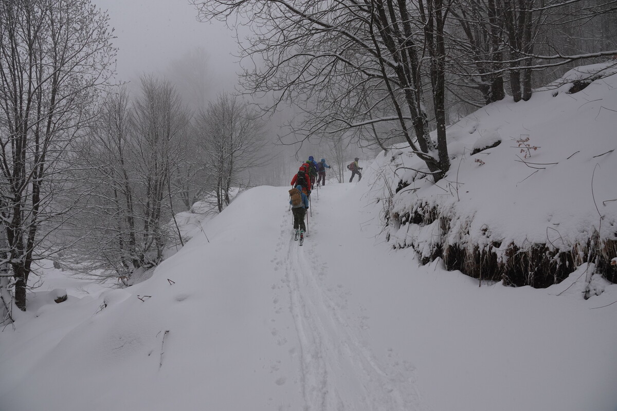 Sprva vlečemo smučino po cesti, pokriti s svežim snegom.