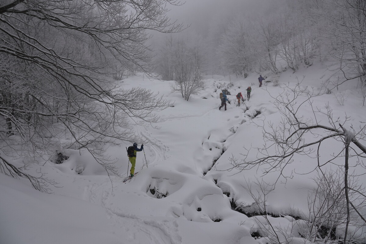 Sledimo dolinici z manjšim potočkom, ki ga moramo večkrat prečkati in sneti smuči.