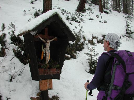 razkropili po vseh vrhovih. Tokrat sva izbrala za cilj Kreuzspitze, ki se lepo vidi iz Villgratna. Po zasneženi cesti, ki je zvožena le od turnih