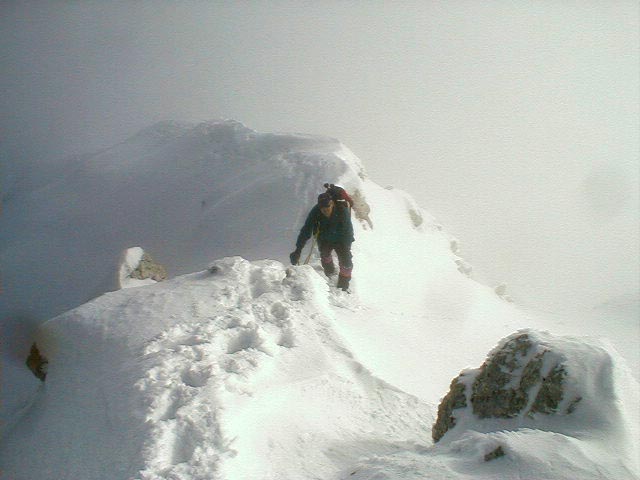 Ker je slo kar v redu, sva se odlocila za jugovzhodni greben. Snega ni prav veliko. Ravno toliko, da se kar dobro namucis do vrha. Zjutraj je bil