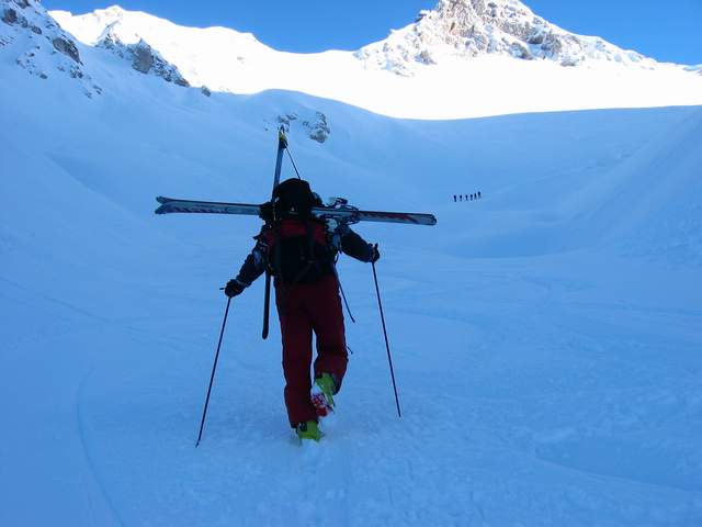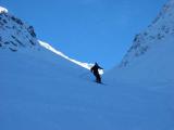 preko smučišča proti prvemu sedlu. Sneg je bil prekrasen cca 10 cm svežega na kar konkretno podlago, tako, da je bilo vse lepo zalito.Ob povratku