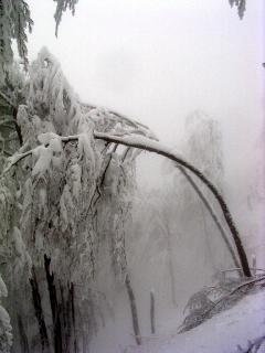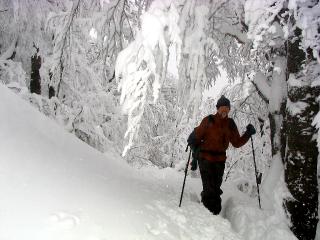 vrhu okrog 1m. Smuka na Prvo Ravan je bila uzivaska, tudi naprej po gozdni cesti je slo super, motita le podrti drevesi na cesti in veliko snega za