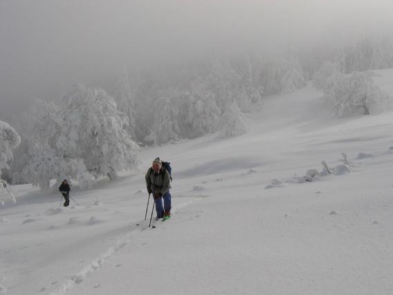 ter dalje do markirane poti in ob njej nato do vrha. Vso pot smo prehodili s smučmi, razen v grapi pri večkratnem prečkanju potoka, jih je bilo