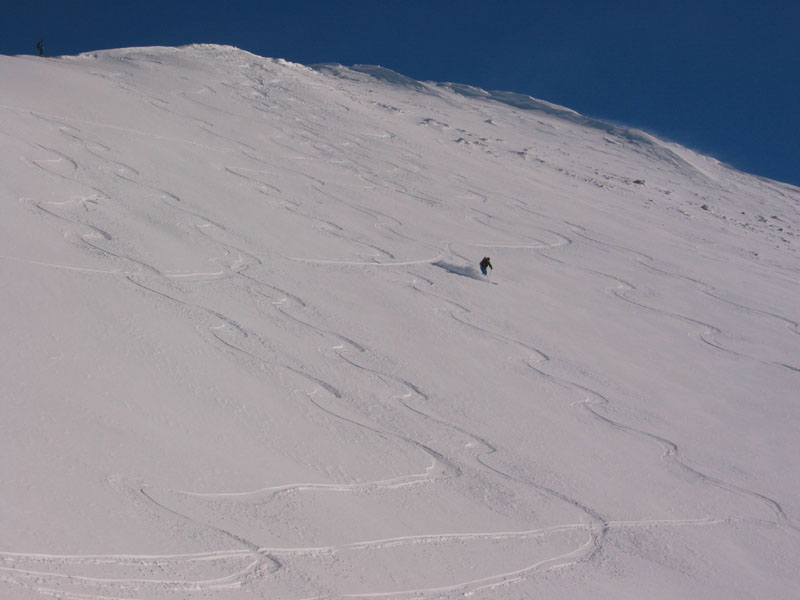 udeja bolj utrjena, vendar ne trda (srenačev nismo rabili). Za smuko je bila najboljša vršna piramida Rodice: 5 cm pršiča na trdi podlagi - čista