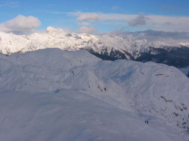 Sneg na Voglu je še povsem nepredelan in še na psih smo morali kar dobro utirati gaz, peš se po mojem ne pride daleč. Na grebenu je snežna