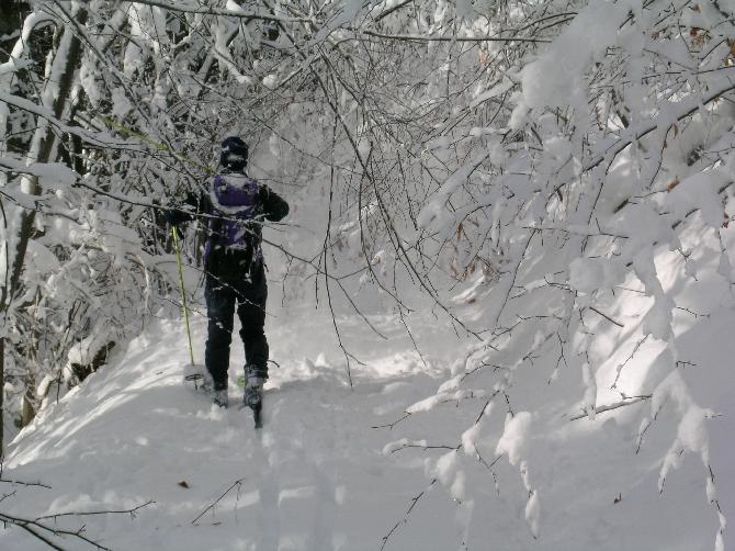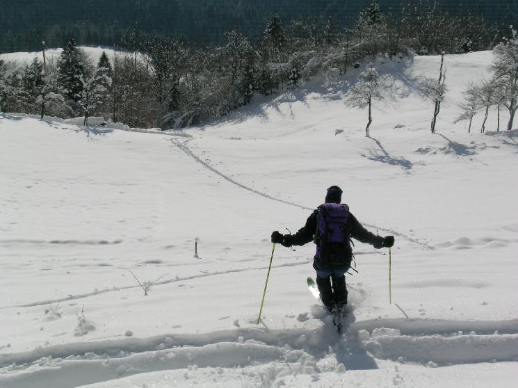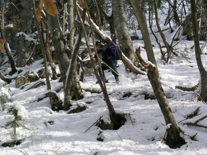vrhov nad Kočevšem. Navzdol je bilo lepo do zabavno: pršič, veje, skale, skorja... France je šel popoldne služit vsakdanji kruh, jaz pa k Aliču na