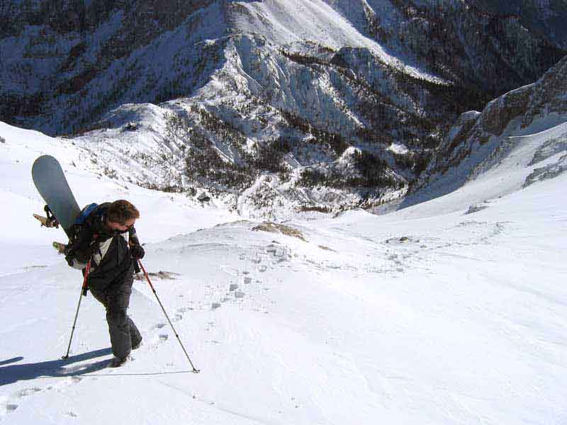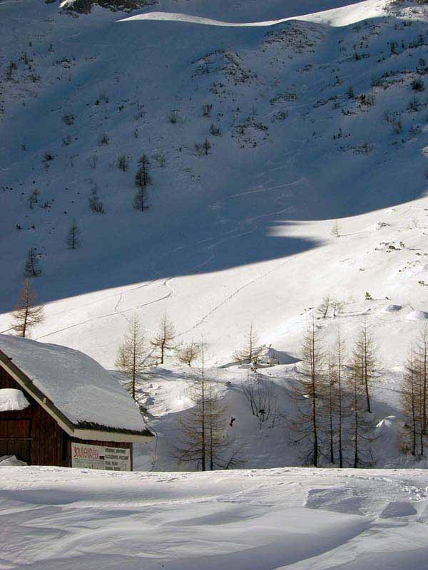 nisva mogla prebiti, nekoliko nižje pa sva že prišla do pršiča. Le-tega je polno predvsem v dolinicah in grapah proti prelazu, tako da lahko rečem da