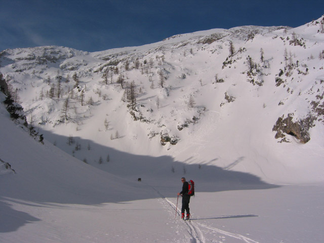 smučmi posipala, tako da smo na zaključnem vzponu pod vrhom motovilili kot že dolgo ne. Z vrha nas je hitro pregnal veter, pri smuki pa se je