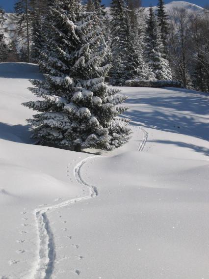 vrha. Spust po vrhnji flanki je bil resnično fenomenalen. Kakih 30 cm nedolžnega suhega pršiča na trdi podlagi je nudilo veliko užitkov. Tudi po