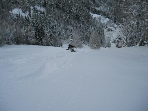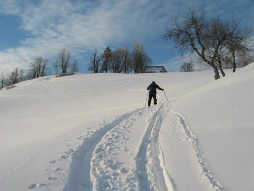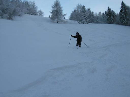 Na Osolniku je bilo danes popoldan 40 cm suhega snega in enajst turnih smučarjev. Strmino pod cerkvijo smo dodobra porisali (Tone in Franc
