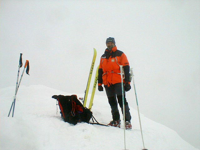 takrat, ko sva bila na vrhu se je pripodil od nekje oblak, zapihal je veter in pricelo je sneziti. Slaba vidljivost je unicila namisljeni uzitek ob