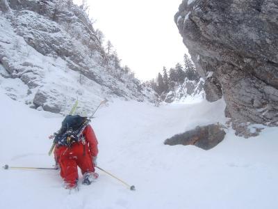 en prehod S5. Prišla sva 50m pod vrhom stene. Začela sva z balvana, ki se je kar strmo prelomil. Smučarija pa je bila v grapi čista poezija užitka.