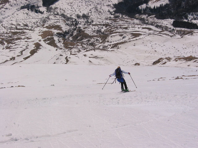 smuko: prvih 200 višinskih metrov je bil lepo omehčan sren, nižje pa so se začela menjati pobočja z utrjenim in predirajočim se snegom, kjer je bilo