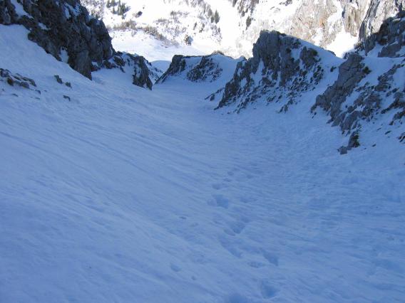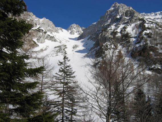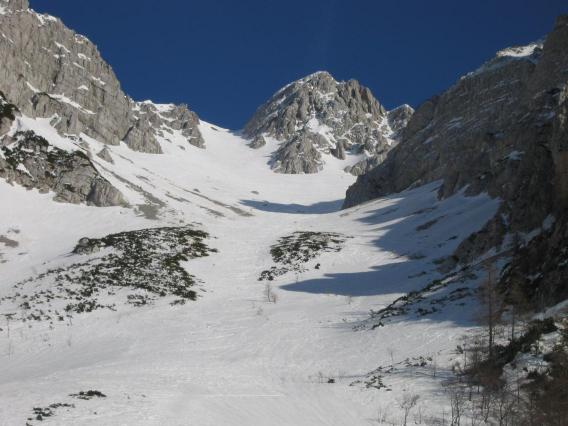 Begunjščica (Domen, 17.03.2004)Ko sem se ob 12.00, vseskozi v zavetju klime pripeljal na Ljubelj, kaj dosti več od prijetnega popoldanskega razgibavanja nisem upal pričakovati. Na vrhu smučišča sem seveda poškilil na plaz in našel odlične razmere za vzpon. Sneg je bil ravno toliko odjenjan, da so psi dobro prijeli, predrl se je le tu in tam kak korak. V trenutku sem bil na sredini plazu, kjer je bilo že toliko trdo, da sem peš nadaljeval do Osrednje grape in skoznjo (trdo, pod grebenom za vzorec klože) odpikal na vrh. Tam sem opazoval dva planinca, ki sta se spuščala proti Robleku. Vse skupaj je bilo videti precej mučno in glede na travnato podlago tudi precej nestabilno. Ne priporočam. Za spust je bil že vnaprej določen edini še preostali "dolg", Smokuški plaz. V zgornjem delu še ob 3h popoldne odlična smuka, kakih 10 cm odjenjanega na precej trdni podlagi. Spodaj je bil sneg seveda precej globje odjenjan (smučal sem v kratkih rokavih) a še vedno toliko kompakten, da se je dalo povsem kulturno peljati. Od Smokuške planine, mimo Tinčkove koče do Žage je potem letelo kot sneta sekira, dalje do elektrarne pa je bilo že precej krajših kopnih odsekov, ki jih je bilo v sredo še smiselno poštamfati, danes pa šmuka" pod Žago verjetno ni več smiselna. Cesta iz Završnice je sicer splužena in prevozna le do eletrarne, sam pa sem se na smučeh udobno pripeljal skoraj do prvega travnika nad nogometnim igriščem in točno na asfaltni meji presedlal v avto. Medtem, ko je bilo v žlebu in na Šentancu vse prerito podolgem in počez, so Smokuški plaz kazile sledi le enega predhodnika. In čeprav je v zgornjem delu smuka v Osrednjo grapo morda res atraktivnejša, pa je ambient v Smokuškem plazu zagotovo najlepši, saj ga ne kazi zeleniško smučišče. Turo se da seveda zaključiti tudi nazaj na Ljubelj, s kratkim vzponom iz Smokuške planine na Zelenico. LP, Domen