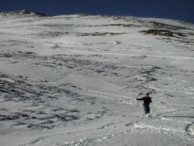 močan veter, ki je s skal že odnesel večino snega, zato smo