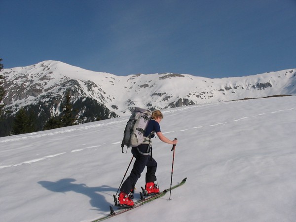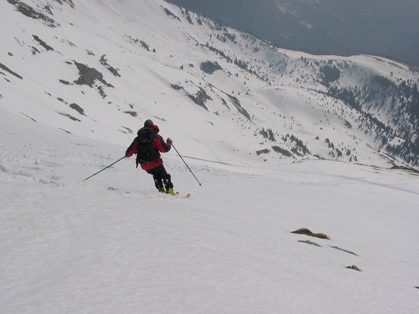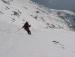 Spust z vrha malo pred dvanajsto. Vreme nepričakovano povsem jasno, seveda toplo, zato je bil sneg zmehčan in se je v zavojih vdiralo do 20