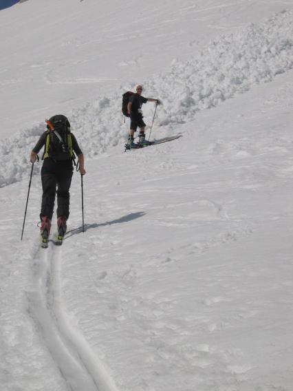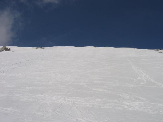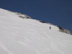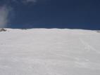 spust po flanki pod Jezerca. Fantastične razmere, trdo in kak cm odjenjano. Spust z V. Draškega vrha malo pred poldnevom že precej južen. Še