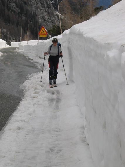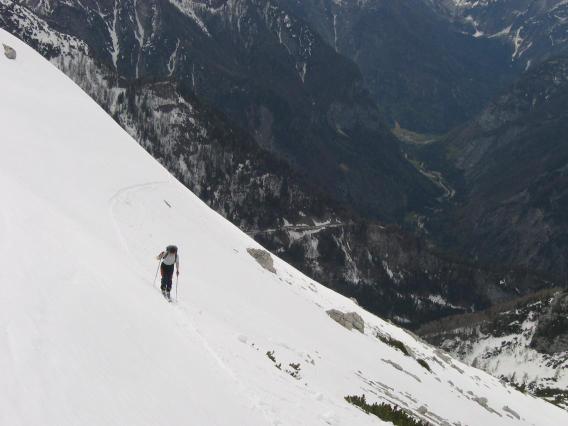 Ob 10.00 naju je Vršič pričakal prav romantično osamljen. Pozna ura je botrovala, da je bil sneg na gornji flanki odjenjan v globino vsaj