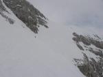 plastjo južnega snega, na kateri nas je močno zažigalo sonce. Smuka (z vrha ob 14h) je bila zelo dobra do odlična vse do vznožja žleba, do bivaka je