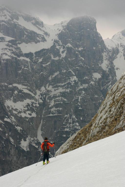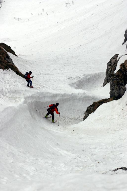 grabi smuči, od razpoke dalje odličen ojužen sneg, ki omogoča krasno vijuganje in pripelje vse do doline.