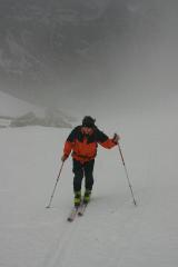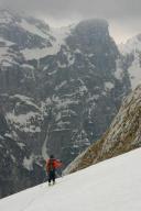 sotrudnika nadaljevala v strmo pobočje grebena Bovškega Gamsovca obdano z meglo. Smuka navzdol odlična. V zgornjem delu rahlo zmehčana plast malce