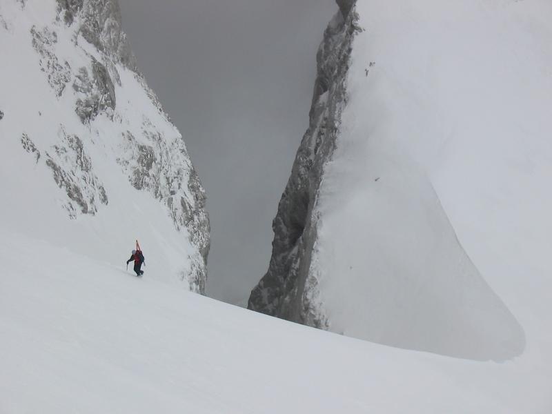 Jalovec, Palec-Vrtača, Stol (Stašo, 29.04.2004)Čudovit smučarski teden je za nama. Opravila sva tri spuste in pri tem imela lepo vreme dobre razmere. Vsako turo sva začela zelo zgodaj, kar se nama je obrestovalo. 26.4. sva se podala v ozebnik Jalovca. S Tamarja sva ga opazovala še v celoti nato pa ga je kmalu zajel oblak tako kot ostale vrhove. Kljub temu sva nadaljevala po čedalje bolj zbitem in še ne predelanem snegu. Na vrhu prava zima. Mraz, veter in megla so naju prisilili, da hitro natakneva smuči in se spustiva v ozebnik. Do polovice ozebnika je bila potrebna skrajna pazljivost saj je spust poleg megle oteževal tudi žleb, ki je precej širok. Od polovice pa smuka idealna. Pripeljala sva se do avta, ki sva ga pustila pri zapornici v Planici. (v ozebniku ni padel niti en kamen, po vsej verjetnosti zaradi zgodnje ure in mrazu). 28.4. sva se odpravila iz Podna v Žleb Palca. Že zjutraj je kazalo, da bo lepo sončno vreme in tako je tudi bilo. S smučmi sva prišla do prvih skal nato sva si nataknila dereze in odrinila proti meji. V zadnjem delu Žleba je bilo kar nekaj padajočega kamenja tako, da čelada ni bila odveč. Z ruševja sva se podala še v žleb Vrtače in na vrh do cepina. Skupaj s kavkami sva se malo okrepčala nato pa nataknila smuči in spust po smeri vzpona. Žleb Vrtače je bil precej strm in ozek v zgornjem delu, zato sva se poskušala držati bolj prisojene strani, kjer je bil sneg bolj mehak. Spust v ruševje prava ''uživancija''. Nato pa še Žleb Palca, ki pa je bil ravno tako super kot Vrtačin, o padajočem kamenju pa niti sledu. Zopet sva se pripeljala do avta. 29.4. sva se zopet odpravila v dolino Poden in opravila klasičen turno smučarski izlet na Stol. Zgodnja ura je botrovala lepemu sončnemu vremenu, saj so se malo po tem, ko sva dosegla vrh že pričele pojavljati meglice. Za spust sva si izbrala manjšo ne izrazito grapo, ki še ni bila ''zorana''. V Kožnah pa je Miču počila vez (Fritschi-titanal I.). Po vsej verjetnosti veste zakaj gre. Od sedla Vrtače je po precej južnem snegu odsmučal do avta po eni smučki. Stašo in Mičo