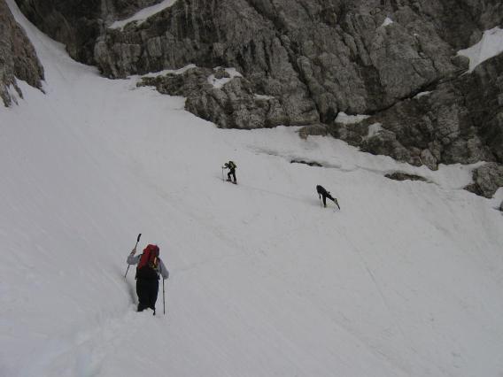 odjenjan žleb na škrbino. Ocena spusta iz škrbinice mi ni znana, je pa po težavnosti primerljiv z vzhodnim žlebom Vrtače, torej nekje III+. Sneg malo