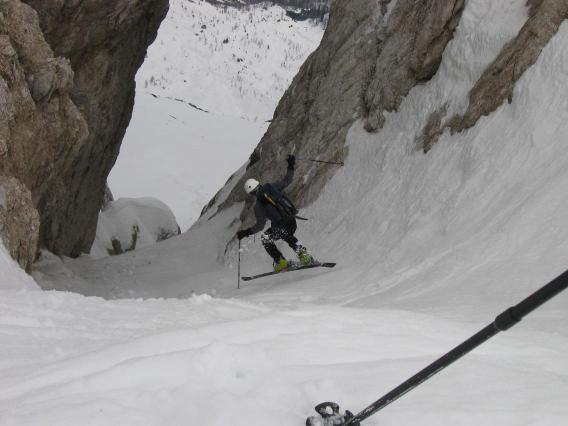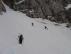 dovolj za vzpon na smučeh, medtem ko kake bajne smuke na tem odseku letos ne bo več. Nad krnico po razmočenem terenu do žleba in skozi prav tako