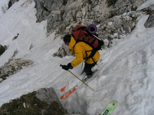 sedlom so zabavni in je treba kar nekaj pazljivosti. Potem pa nas je čakal nepredelan moker sneg in plazovi, ki so nas prisilili, da smo šli na