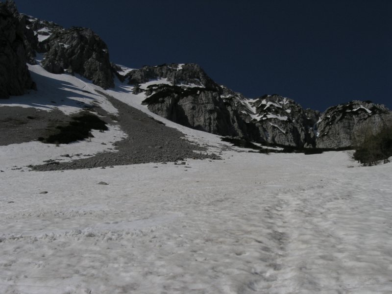 tej grapi. Sneg je bil že zjutraj prijetno mehek. Dereze sem nataknil bolj zaradi lepšega. Navzdol sem šel do grla v družbi manjših plazov, potem pa