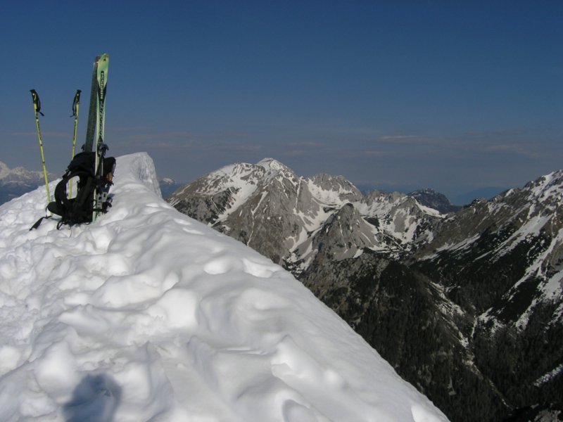 zgodnje vstajanje, ob 8.15 sem se danes že grel na vrhu Begunjščice in futral prijazno kavko. S snegom je pa takole: do srednje postaje je regrat in