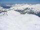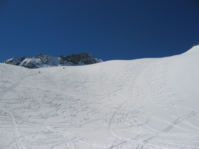 grebenu na 3050 metrih. Zjutraj je bil sneg zmrznjen, srenači so prišli kar prav. Smuka navzdol do 2800 m višine bolj problematična zaradi skorje,