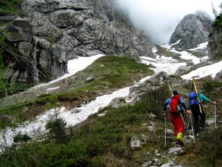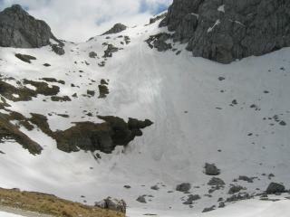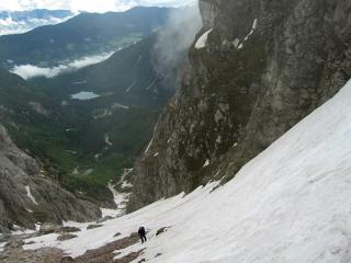 višine 2300 m nad Mangartskim sedlom. Smuka v konto po mehkem snegu odlična. Vzpon do prehoda v Plazje na dveh mestih kopen, in nato najlepše: po