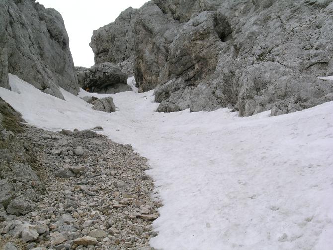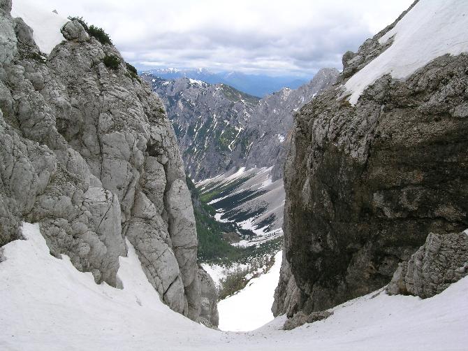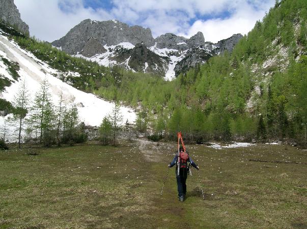 Čez škrbino na Velo polje (Jurij, 06.06.2004)Po velikem spoznanju, da večerno taborjenje na izhodiščni točki ture ne pomeni tudi zgodnejšega začetka ampak (seveda) ravno obratno, sva se v Krmo raje odpravila kar zjutraj. In to nesramno zgodaj zjutraj. Pot je kopna z občasnimi flikami snega vse do razpotja na Bohinjska vratca in Staničevo kočo. Tam sva izbirala levo ali desno, pa spet levo ali desno… Ker nisva in nisva dobila skupne rešitve sva izbrala kompromisni predlog: ne levo ne desno ampak kar naravnost! Morava sicer priznati, da sva oba ves čas z enim očesom opazovala lepo zalito škrbinico med Činkelmanom in Vernerjem. Do škrbine je bila snežna odeja zvezna, sneg pa vedno bolj trd. Dereze, ki sva jih nataknila že na začetku so se nama na koncu kar obrestovale. Na škrbini sva se ozrla na drugo stran in modro ugotovila, da je tudi grapa na zahodno stran lepo zalita. Kakšne razmere!!! Krasna smuka do Velega polja, poležavanje v topli travi, potem pa spet smučke na nahrbtnik in do koče na Velem polju. O d koče do Bohinjskih vratc s psmi, potem pa spet smuka do razpotja, kjer sva končala najino krožno pot. Kljub velikemu optimizmu, da bova presmučala še nekaj deset višinskih metrov naju je ob pogledu na zeleno ruševje srečala pamet. Bilo bi sicer zabavno, ampak pir bi se oddaljil za kakšno urico ali dve, kar pa tudi ni zanemarljivo. Tako pa sva bila hitro na Bledu, kjer sva z veseljem ugotovila, da so tla povsem mokra. Ja, vreme nama je pa res stalo ob strani… France boš še kakšno sliko prispeval… France in Jurij.