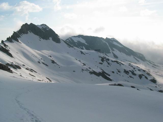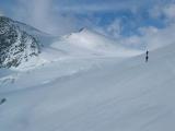 sončnem vreme nadaljevali, vendar se je vreme slabšalo. Z vrha smo smučali v popolni megli(ob 10.00), ki pa se je razkadila na 3500m in nadaljevanje