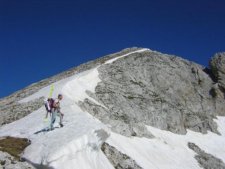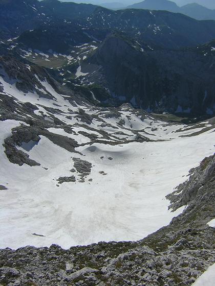 sneg (še obilno zasnežen), sledi nekaj vzpona na sedlo v vzhodnem grebenu in spust do izteka zelenic na 1800+m. Kljub zelo borni snežni odeji je šlo