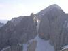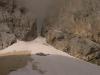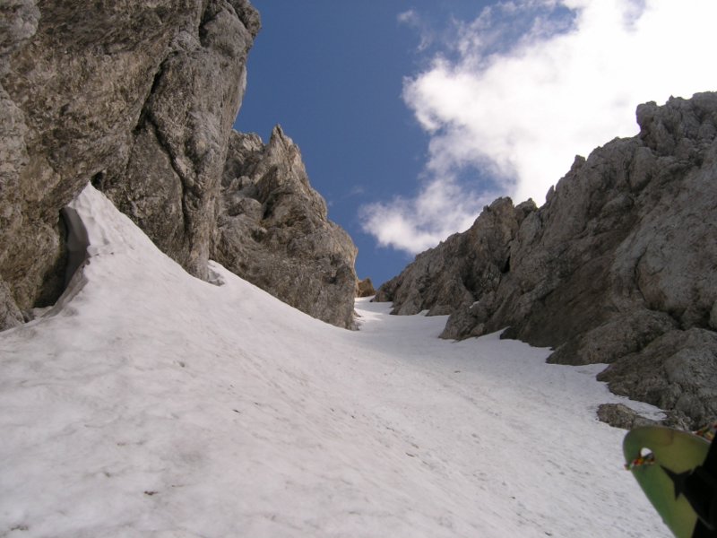 Rokavski ozebnik in Jugova grapa (AlešS., 04.07.2004)Za konec tedna sem ostal sam, le z veliko željo da bi šel kam smučat. Samotarska vožnja v Avstrijo me ni mikala, na Križu sem bil v četrtek – pa sem se spomnil Uroševih opisov - Rokavski ozebnik in Jugova in vse skupaj skombiniral v eno turo. Uroš, hvala za idejo. Bilo je več kot fantastično. V soboto sem ob pol enih štartal v Martuljku. Navzgor je šlo hitro, sneg se začne 60 m pod tremi macesni, potem ga zmanjka za 120 višinskih metrov, nato pa je praktično neprekinjen do vrha Jugove. Le spodnji skok je treba prečiti 10 m po skalah. Jugova je fenomenalna. Sneg je predelan in je prav vseeno kdaj smučaš. Jaz sem bil na vrhu ob petih popoldne in bi me odlične razmere in sonce skoraj speljale nazaj. Z vrha Dovškega Križa je bil pogled na Rokavski ozebnik dovolj prepričljiv, da sem peš odštorkljal proti Bivaku II. 100 m nad bivakom sem celo nataknil smuči in se do njega odpeljal. Po kratkem samevanju so se pridružili še štirje stanovalci. V nedeljo zjutraj ni bilo pričakovano lepega vremena. Vrhovi so se skrivali v megli. Tako je šlo na ozebnik še hitreje, saj ni bilo treba občudovati okolice. V dobri uri sem bil na vrhu, potem pa juhuhu, po idealnem snegu z malo kamenja in malo abručanja čez spodnji skok, drugače pa pravo uživaško poskakovanje po ozebniku. In spet smuči na rame in v meglo do vrha Jugove grape. Izstop iz Jugove na sedlo je kopen in kot vedno zabaven za sestop v pancarjih, še posebej s smučmi na hrbtu. Potem pa še veliki finale: prvi zavoj s stisnjenimi zobmi potem pa uživanje od leve do desne špaltne, po idelanem snegu z zelo malo kamenja za ta letni čas. Smuči sem dal dol le 2x: čez spodnji skok 10 dolžinskih metrov in nad 3 macesni za 120 višinskih metrov. Grapa pod 3 macesni je zasnežena ampak zelo kamnita. Smuči sem snel na 1450m. Od Bivaka II. pa do konca snega sem za vse vzpone in spuste porabil 4 ure. Do avta je bilo treba peš eno uro in dvajset minut. Glede na količine snega bo tura zanimiva vsaj še 14 dni. Še vedno nasmejan Aleš