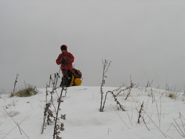 sedla pod Velikim Javornikom. Sneg je ponoči pomrznil, smreke so nam nudile zavetrje in tako smo se prav prijetno povzpeli na vrh. Tu nas je