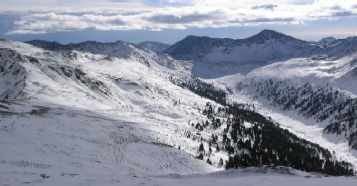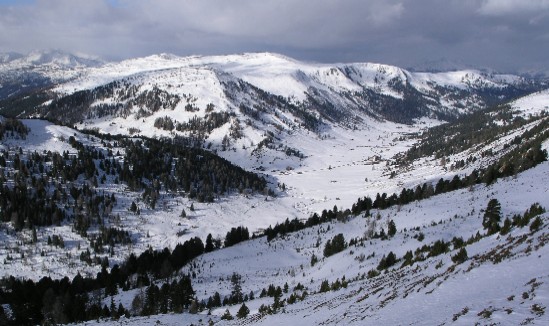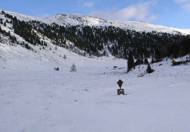 Nockbergi so pokriti le s skromno snežno odejo, zato sem se odločil za turni smuk bolj pohodne narave. Iz Schoenfelda sem na smučeh odšel po
