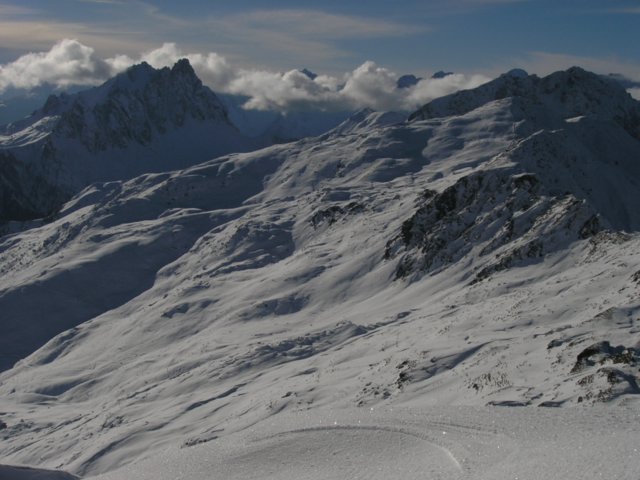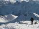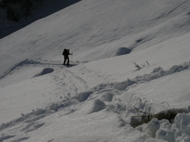 Reiterkarspitze, 2422 m (AlešS., 04.12.2004)Po podatkih, ki so ostali v glavi od bežnega poslušanja poročil o sneženju in napovedi za konec tedna, sva se s Francetom zlahka odločila za Karnijske Alpe. Še toliko lažje, ker je po poletnem kolesarjenju z Mojco, postala želja po smučarskem odkrivanju tega dela Alp zelo velika. Vožnja mimo Beljaka in po Ziljski dolini vse tja do Kötschach-Mauthena mine hitro – 2 uri iz Ljubljane. Če imaš pa meglo, kot midva, in ti ni treba gledati hribov pa še hitreje. Naprej cesta poskrbi da gre malo počasneje. Še eno uro sva porabila do parkirišča ob zilji v Winklu med Ober- in Untertilliachom. Po ozko spluženi a smučljivi cesti sva šla s smučmi do Gartlhütte, potem pa več ali manj naravnost čez pobočje navzgor na vrh. Pobočje je en sam turnosmučarski raj. Ko pa prideš na vrh in imaš tako lep razgled kot midva, te pa itak šele mraz spravi nazaj v dolino. In ugotoviš, da Karnijske Alpe niso samo greben kot ga vidiš iz doline, ampak neskončno turnosmučarsko prostranstvo. Sneg je ostal večinoma le od zadnjih padavin, malo uležan pršič. Ker je pobočje večinoma travnato, kakšnega hudega škrtanja ni bilo. Plitve grape z nekaj več napihanega snega, so nudile neskončne užitke. V dolini je bilo čisto malo skorje, ki pa je samo polepšala smučanje z malo bolj intenzivnim smučarskim gibanjem. Na koncu še smuk po cesti v upanju, da naproti ne bo nobenega avtomobila – in ga ni bilo. Zadnji zavoj sva naredila pred avtom in zaključila 1200m visok spust. Aja, in ves čas sva imela sončno vreme in sva tudi zato še zmeraj nasmejana France in Aleš.