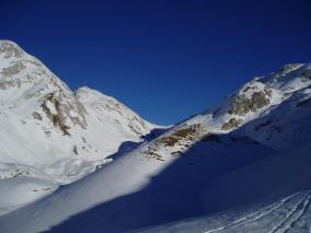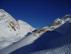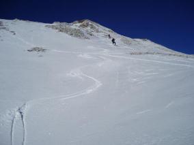 napredovali kar peš. Približno na 2000 m je sneg postal bolj suh s tanko skorjo in morali smo natakniti smuči. V popolnem brezvetrju in prijetnem