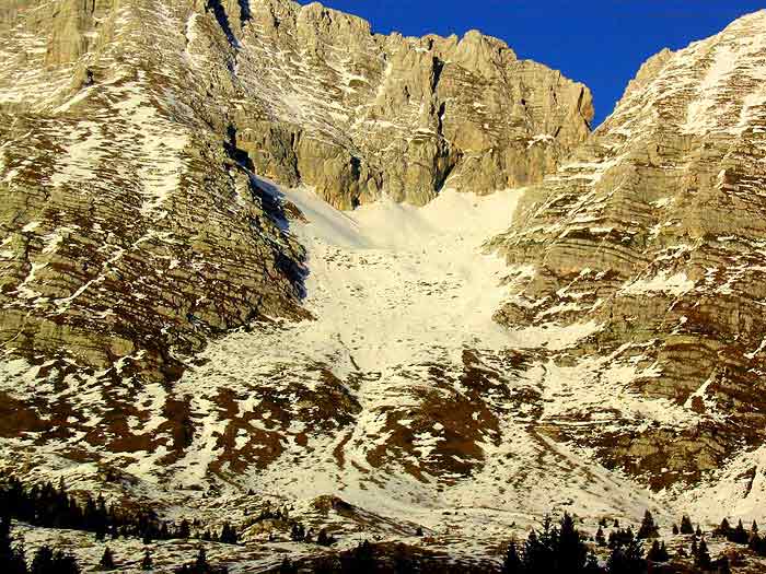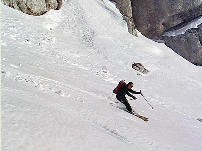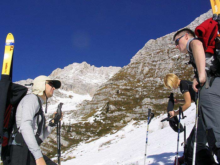 za mejo, v Zahodnih Julijcih. Južna, predelana pobočja pod Montažem so idealna za zgodnjo smuko, a tokrat so bila le preveč gola. Zato smo jo ubrali