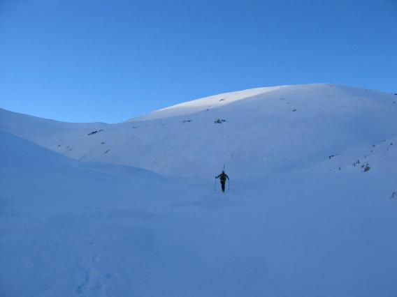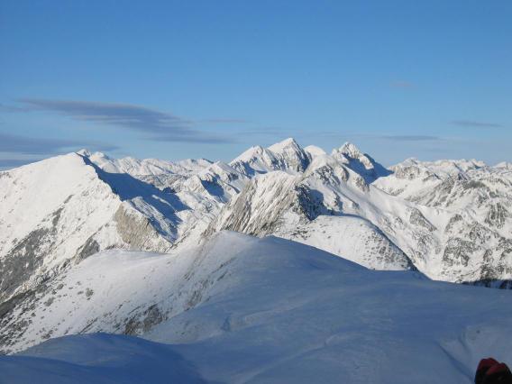 zadnji sneg lepo pokril trdo skorjo. Proti vrhu nam je nagajal veter, ki je bil na vršnem grebenu še bolj izrazit. Vršno pobojčje je lepo zalito in