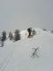 Z vrha pa smo jo užgali na drugo stran, proti lovski koči ob potoku / grabnu Žlebnica. S sedla smo med redkimi macesni urezali vzorne smučine po
