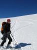 je bila smučina še zelo sveža, smo vzpon opravili navezani. Iz grebena nas je kmalu prepodil leden veter. Smu