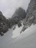 skala gleda ven. Ko boš prismučal/a do dol, ne smučaj tik pod stenami, ker je na snegu ogromno šodra. Drugod ga je bistveno manj. Sledi smuka po