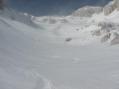 do 20 m/s. Tudi nekaj modrine je še na nebu. Smučam po zimski varianti, sneg napihan na trdi podlagi omogoča prijetno zavijanje, odločim se za